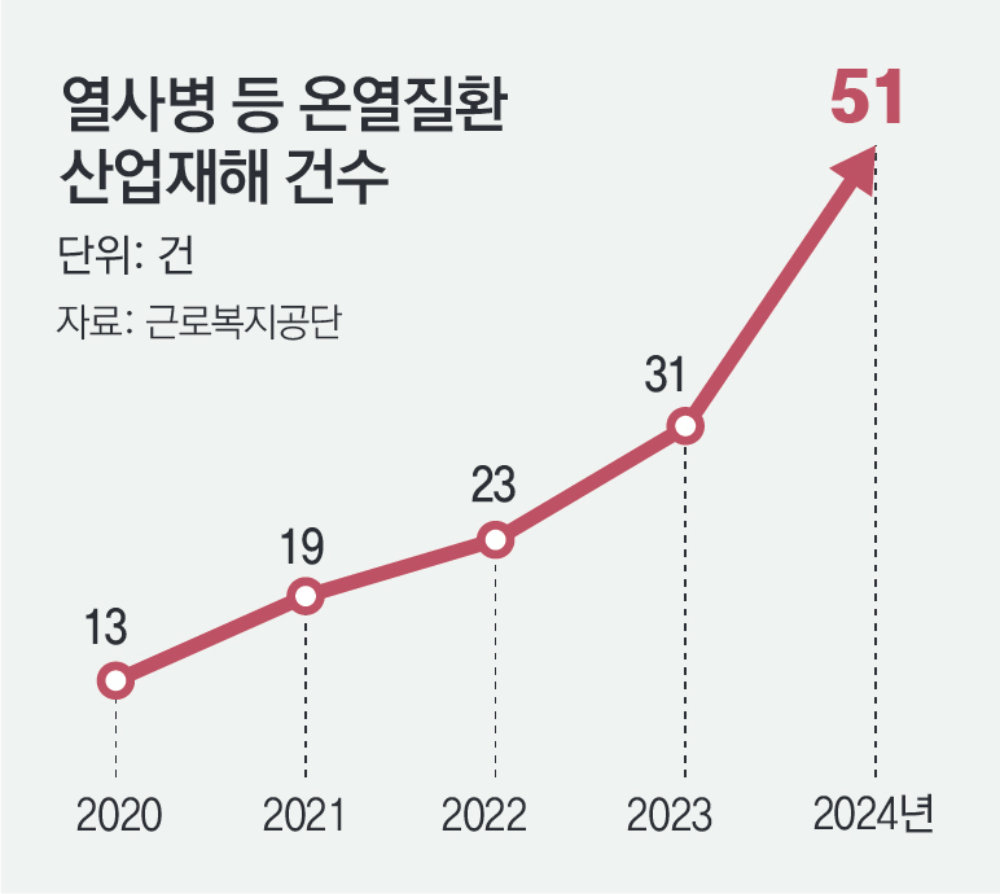 항만처럼 고온 노출 작업장이 늘면서 온열질환 산업재해도 증가하고 있다. 근로복지공단에 따르면 일사병, 열사병 등으로 산재 요양급여를 받은 건수는 2020년 13건에서 2024년 51건으로 4배 가까이로 늘었다. 부두 근로자 김모 씨(40대)는 “열사병도 문제지만, 더위에 집중력이 떨어지면 화물에 깔리거나 지게차에 치이는 사고 위험도 커진다”고 말했다.