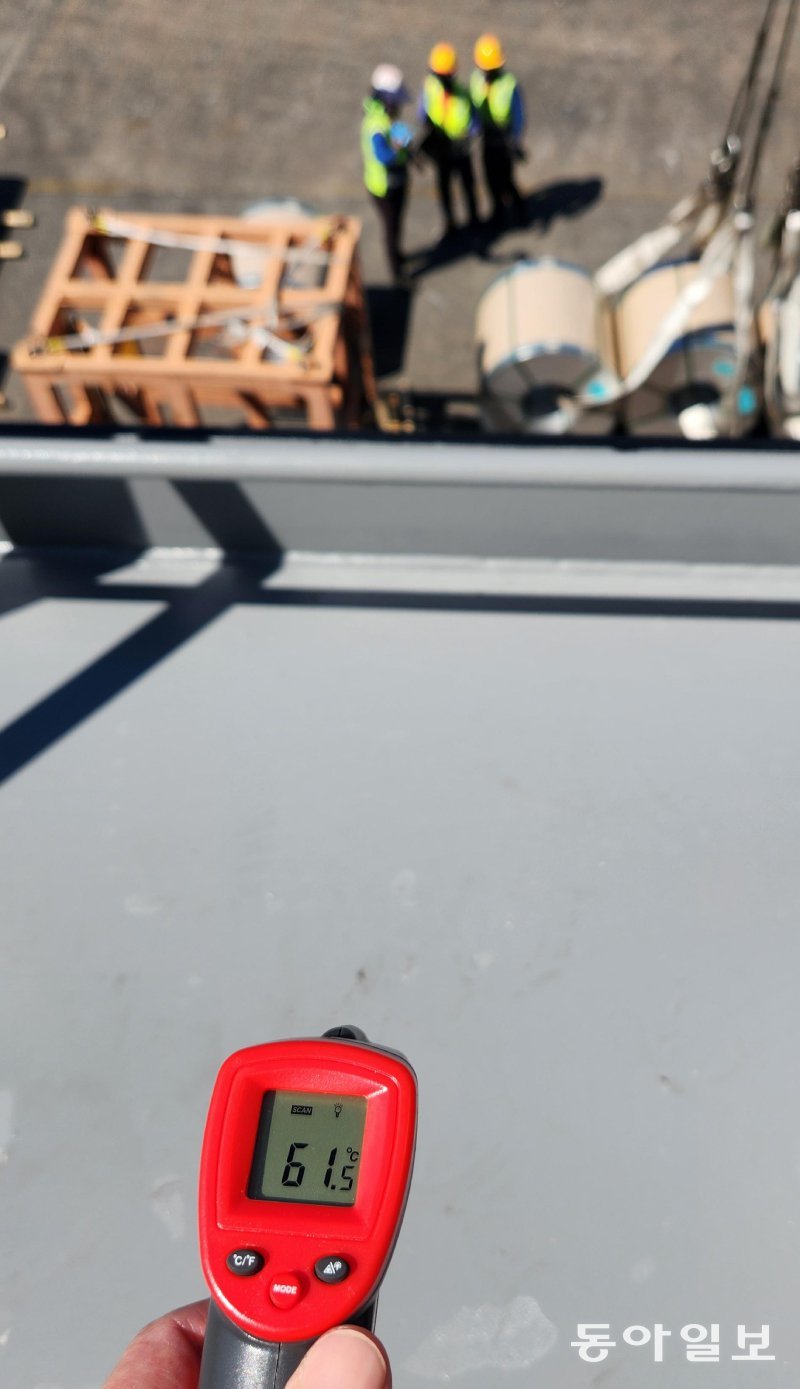 디지털 온도계로 갑판 위 기온을 측정한 모습. 온도계가 영상 61.5도를 나타내고 있다. 부산=김화영 기자 run@donga.com폭염경보가 발효된 이날 갑판 위는 열기로 가득 차 아지랑이가 피어올랐다. 기자가 갑판 위 적재된 철근을 맨손으로 만져보자 손이 델 정도로 뜨거웠다. 근로자들은 장갑을 끼고 작업하지만, 금속 표면 온도가 워낙 높다 보니 장갑 너머로도 뜨거움이 그대로 전해진다고 했다.