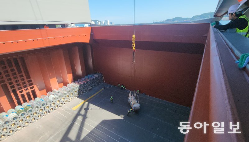 이날 부두에서는 알루미늄 원자재를 선박에 싣는 작업이 한창이었다. 항만 노동자들은 선박에 실린 화물이 항해 중 흔들리지 않도록 고정하는 ‘고박’ 작업을 맡는다. 컨테이너선과 달리 벌크선은 철근, 철판, 금속 코일 등 중량 원자재를 싣기 때문에 철제 끈을 X자 형태로 교차해 단단히 고정해야 한다.