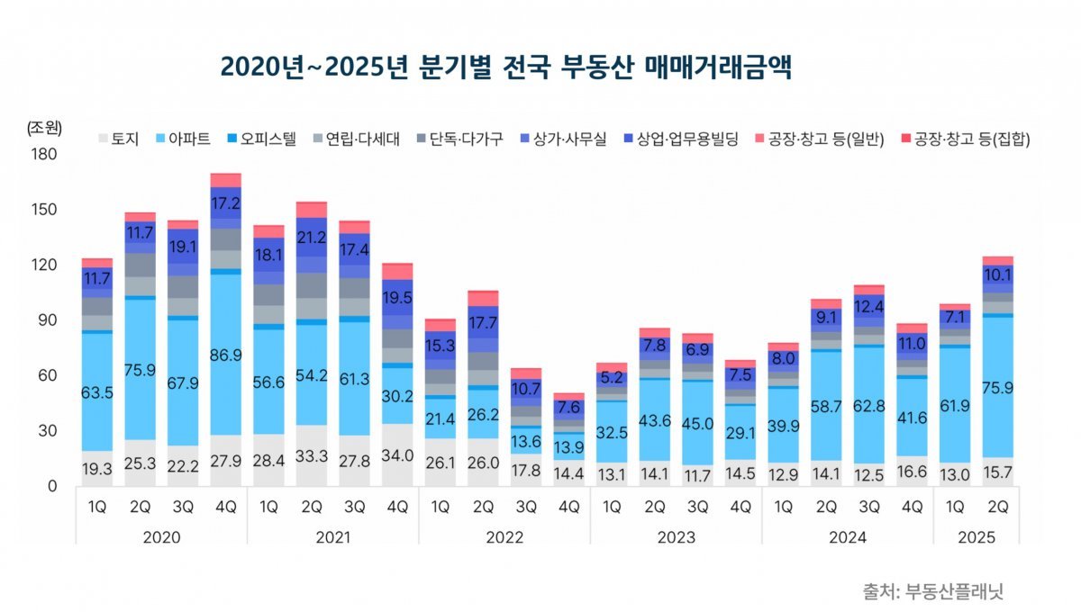 12일 부동산플래닛이 국토부실거래가를 분석한 결과에 따르면 124조 6778억 원으로 전 분기(98조 9751억 원) 대비 26% 증가했다. 같은 기간 거래량은 15.8% 증가한 29만9197건이다.