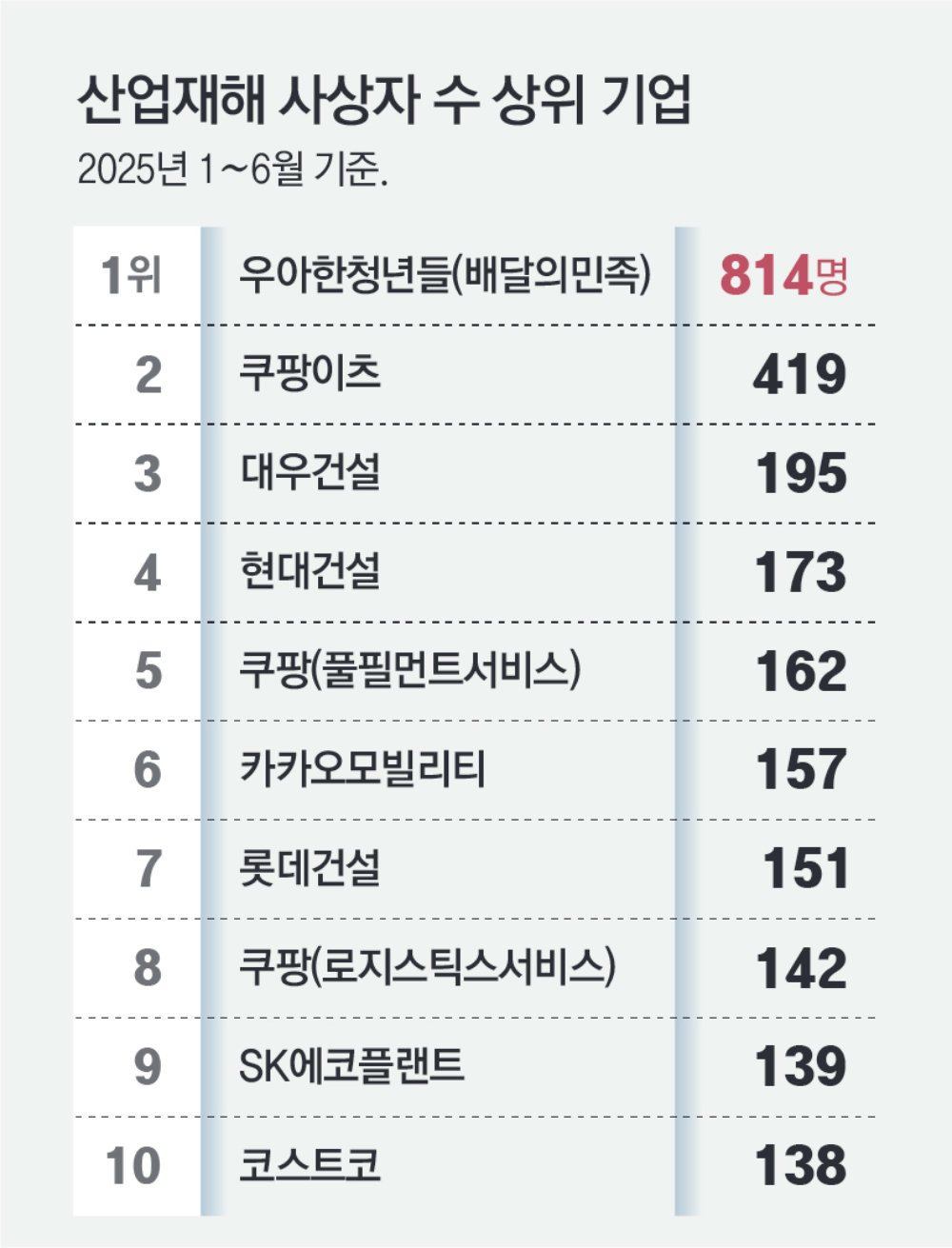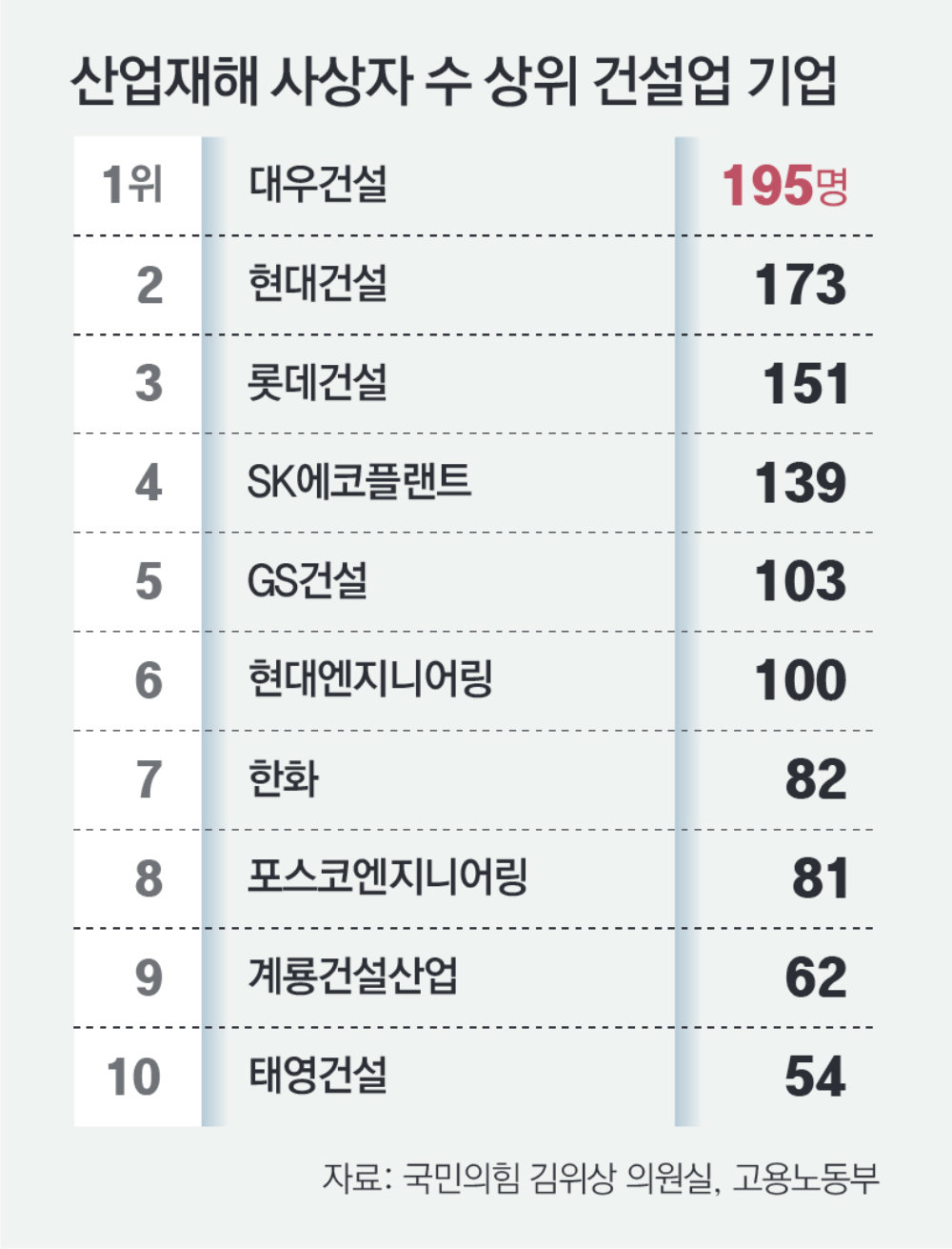 건설업에서 사고 사상자가 가장 많은 기업은 대우건설(195명)이었다. 2023년 기준 건설업 종사자는 181만 명, 플랫폼 종사자 중 배달·운전 종사자는 48만5000명으로 건설업보다 종사자 수가 적은 배달업의 산재가 더 많았다.