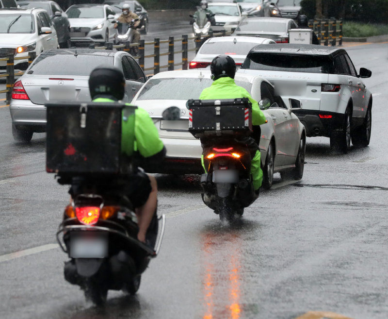 서울 강남역 인근에서 빗길에 오토바이를 탄 라이더들이 배달을 하고 있다. 올 상반기(1∼6월) 산업재해 사상자 수가 가장 많은 기업은 배달의 민족, 2위는 쿠팡이츠였다. 뉴스1● 근로환경 열악 배달업, 건설업보다 산재 많아