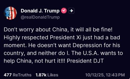 트럼프는 12일(현지 시각) 중국 측이 희토류 통제에 나선 것과 관련, “시진핑 중국 국가 주석이 잠시 실수한 것일 뿐”이라고 말했다.