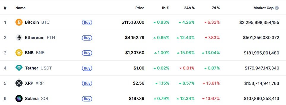 13일 오전 6시 현재 글로벌 코인 시황 중계사이트인 코인마켓캡에서 비트코인은 24시간 전보다 4.26% 상승한 11만5187달러를 기록하고 있다.