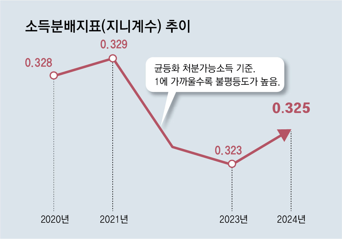 이 같은 현상이 계속되면 가뜩이나 심해진 소득 양극화를 더 부추길 것이란 관측이 나온다. 소득 불평등 정도를 보여주는 지니계수(균등화 처분가능소득 기준)는 지난해 0.325로 전년 대비 0.002 올랐다. 2021년 이후 3년 만에 상승세로 돌아선 것이다. 지니계수는 1에 가까울수록 불평등도가 심하다는 의미다. 강성진 고려대 경제학과 교수는 중산층의 소득 둔화에 대해 “코로나19 이후 가계부채 증대 등이 누적돼 나타난 현상인데, 방치하면 중산층이 저소득층으로 주저앉아 소득 분배를 더 악화시킬 수 있다”며 “정부는 내수와 고용을 살릴 수 있는 성장 전략에 집중해야 한다”고 말했다.