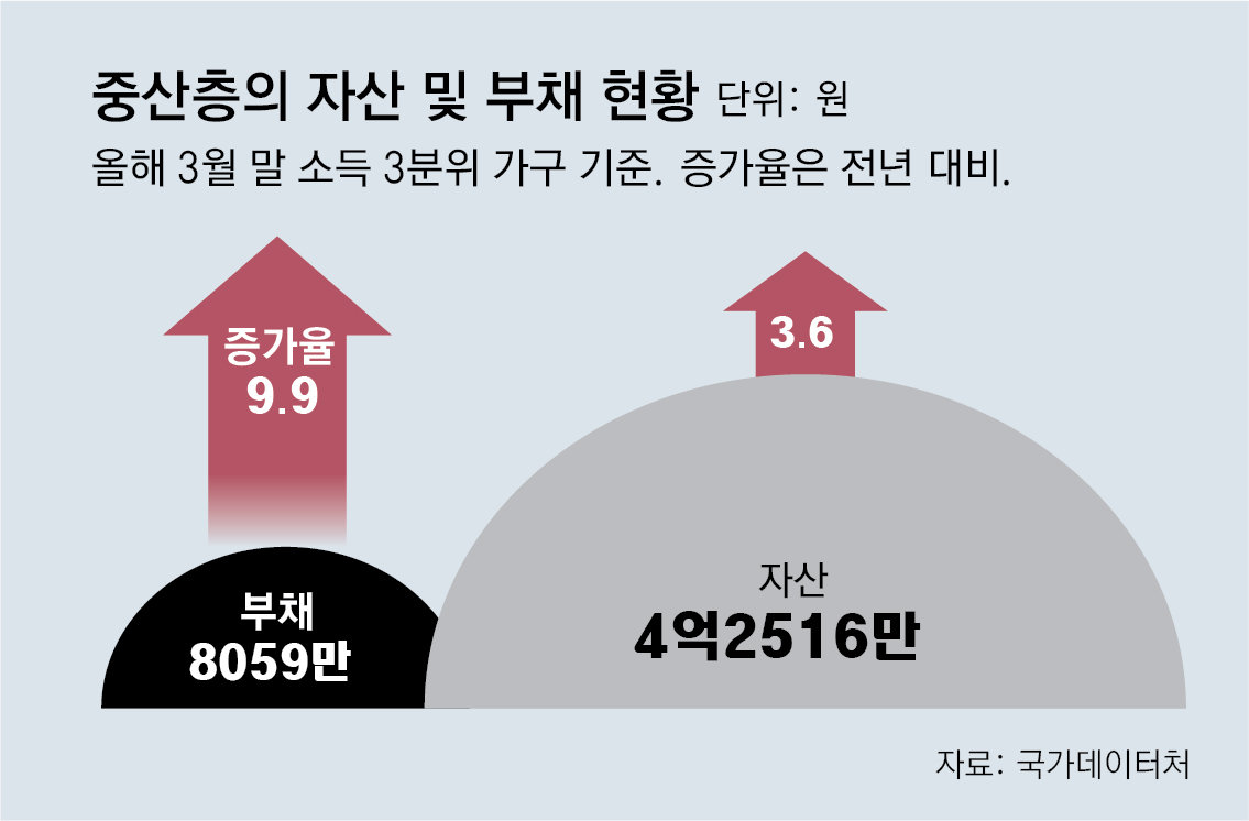 중산층의 팍팍한 살림살이는 자산과 부채 현황에서도 드러났다. 올해 3월 말 기준 소득 3분위 가구의 평균 자산은 4억2516만 원으로 1년 전보다 3.6% 늘었다. 자산 증가율은 전체 가구의 평균인 4.9%를 밑돌았다. 반면 이들 가구의 부채는 8059만 원으로 1년 전 대비 9.9% 증가했다. 자산보다 부채가 더 빠른 속도로 늘면서 순자산액은 약 3억4457만 원으로 1년 전보다 2.2% 늘어나는 데 그쳤다. 이 역시 전체 가구 평균 순자산 증가율(5.0%)의 절반 수준이다.