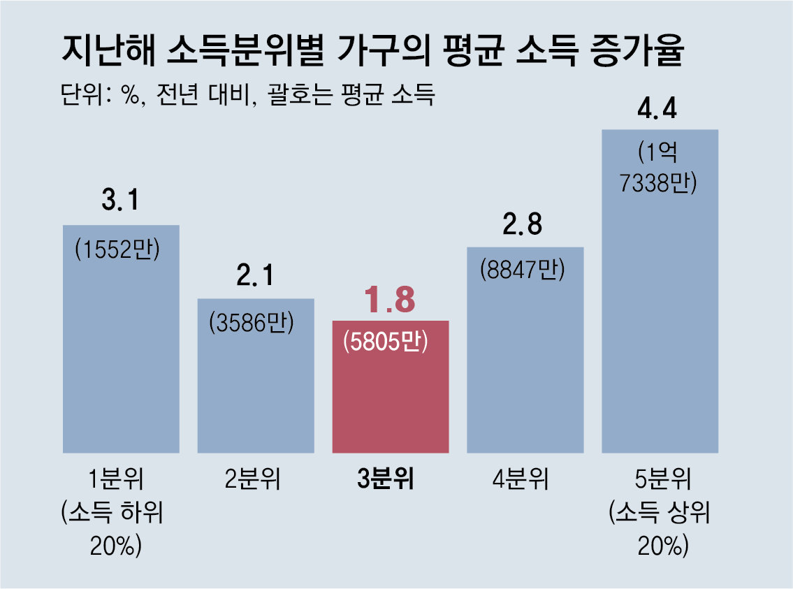 10일 국가데이터처에 따르면 지난해 소득 3분위(상위 40∼60%) 가구의 평균 소득은 5805만 원으로 1년 전보다 1.8% 늘었다. 2016년 현재 기준으로 통계가 작성된 이후 가장 낮은 증가율이다. 지난해 전체 분위 가운데 소득 3분위 가구의 소득 증가율이 가장 낮게 나타났다. 상위 20%에 해당하는 소득 5분위 가구의 평균 소득 증가율은 4.4%였고, 하위 20%인 1분위 가구는 3.1%였다.