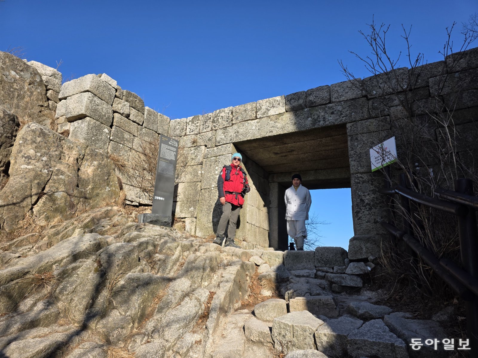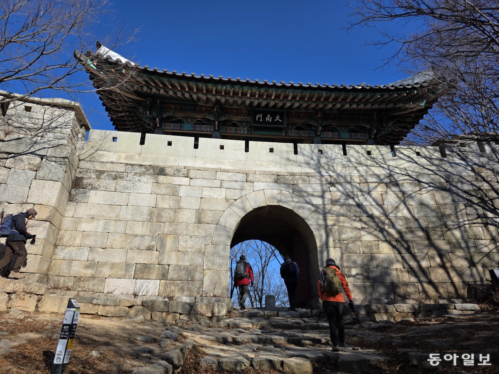 대남문 북한산성탐방지원센터에서 오전 8시에 출발해 낮 12시쯤 대남문(大南門)에 도착했다. 비봉능선을 통해 도성의 탕춘대성과 연결되는 전략상 중요한 성문이었다. 경복궁 창의문을 통해 세검정에서 구기동을 거쳐 북한산성으로 직행할 수 있는 최단코스가 대남문이다. 대문 주변에서 배낭에 싸온 김밥으로 점심을 먹고 있는데, 말레이시아에서 온 등산객들을 만났다. 동남아에서는 겪어보지 못했을 추위를 뚫고 여기까지 올라온 게 대단해보였다.