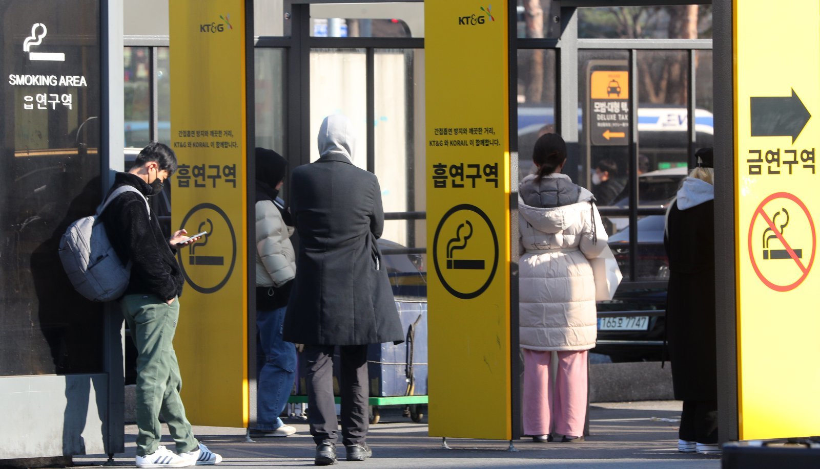 19일 오후 서울 중구 서울역 광장 흡연구역에서 시민들이 담배를 피우고 있다. 서울 중구는 오는 6월 1일부터 서울역광장 일대와 주변 도로 약 5만6000㎡ 면적을 금연구역으로 지정하고, 현장에서 흡연하다 적발시 과태료를 부과한다고 18일 밝혔다. 코레일에서 관리하는 흡연부스에서는 담배를 피울 수 있게 했다. 2024.03.19 뉴시스