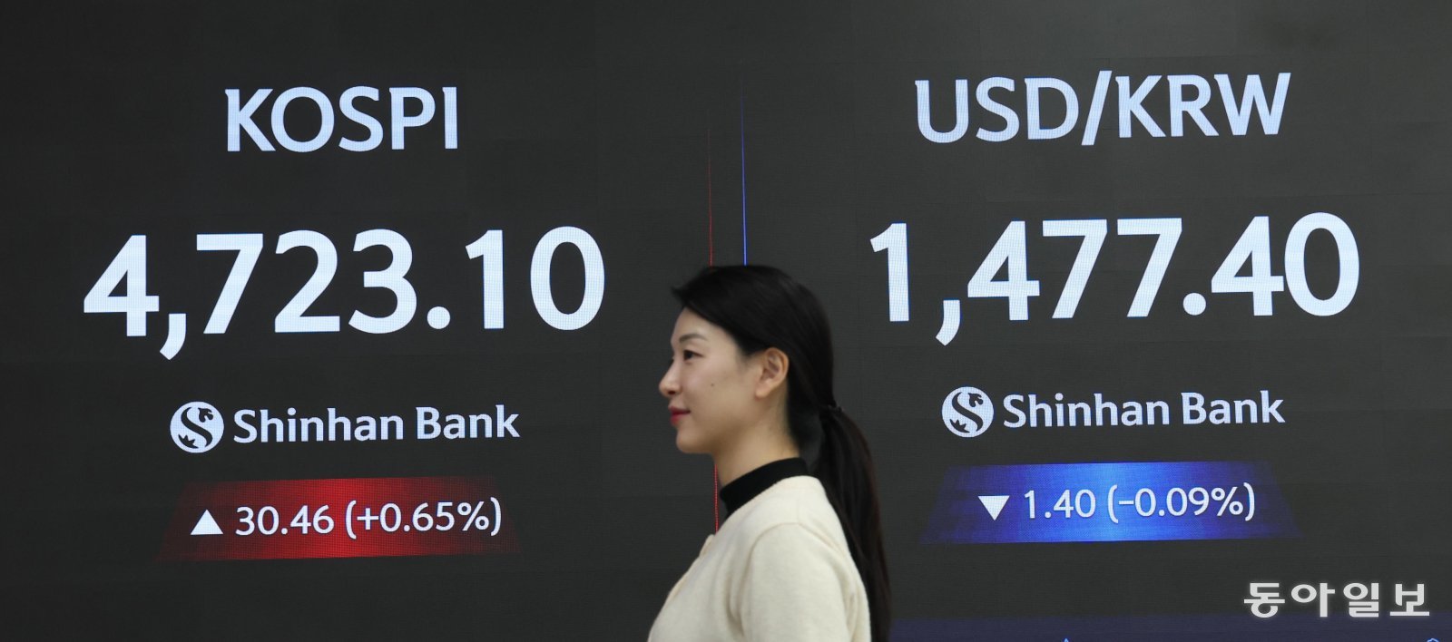 14일 서울 중구 신한은행 본점 전광판에 4,700 선을 돌파한 코스피 종가가 표시돼 있다. 종가 기준으로 코스피가 4,700을 넘어선 것은 처음이다. 김재명 기자 base@donga.com● ‘반도체 투 톱’ 비중 25→37%