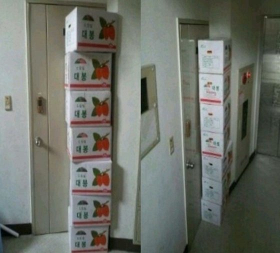 공개된 사진에는 아파트 현관문 앞에 쌓여있는 과일박스가 담겨있다. 택배기사는 일곱 개나 되는 과일박스를 일렬로 쭉 쌓아 현관문을 막아버린 것.