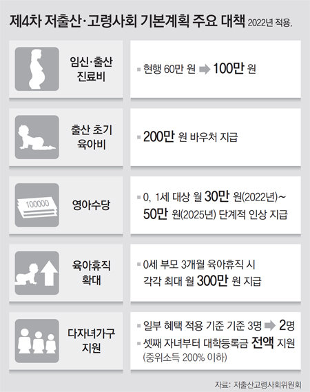 2022년부터 적용될 이번 계획에서 가장 눈에 띄는 건 영아수당 신설이다. 소득과 상관없이 0, 1세 영아를 키우는 모든 부모에게 지급된다. 정부는 2022년부터 월 30만 원을 시작으로 2025년 월 50만 원까지 단계적으로 액수를 인상할 계획이다. 2023년 35만 원, 2024년 40만 원으로 올리는 방안이 유력하다.