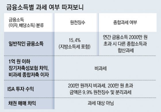 A. 매년 5월 1일부터 31일까지는 종합소득세 신고납부 기한이다. 이자와 배당 등 금융소득은 연간 2000만 원 이하라면 일반적으로 금융기관에서 15.4% 세금만 떼고 끝난다. 하지만 연간 2000만 원을 초과하는 경우 근로소득, 국민연금 등 다른 종합소득과 합산해 종합 과세한다.