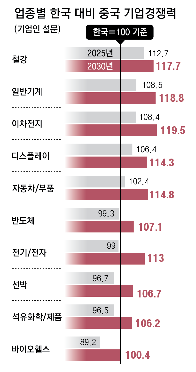 한국의 기업 경쟁력을 ‘100’으로 놓고 보면, 중국은 올해 철강(112.7), 일반기계(108.5), 이차전지(108.4), 디스플레이(106.4), 자동차 및 부품(102.4) 등 5개 업종에서 이미 한국을 앞질렀다. 반도체(99.3), 전기전자(99.0), 선박(96.7), 석유화학(96.5), 바이오헬스(89.2) 등 5개 업종은 현재까지는 한국이 중국을 앞서는 것으로 평가됐다.