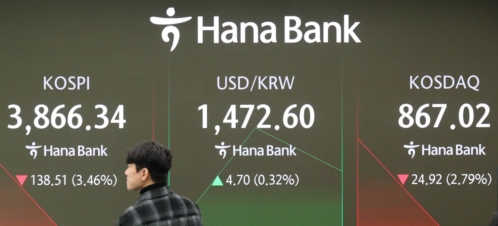 코스피가 전 거래일(4004.85)보다 96.15.포인트(2.40%) 하락한 3908.70에 개장한 21일 오전 서울 중구 하나은행 딜링룸 전광판에 지수가 표시 되고 있다. 코스닥 지수는 전 거래일(891.94)보다 24.49포인트(2.75%) 내린 867.45에 거래를 시작했다. 원·달러 환율은 전 거래일 주간거래 종가(1467.9원)보다 4.5원 오른 1472.4원에 출발했다.2025.11.21. [서울=뉴시스]환율이 1500원을 넘보며 금융시장의 긴장감이 고조되고 있다. 미국의 금리 인하 기대가 후퇴한 데다, 원화와 동조성이 높은 엔화 가치도 약세를 보이며 불안 요인으로 작용하고 있다. AI(인공지능) 거품론 확산으로 위험 선호 심리가 한풀 꺾이며 외국인의 증시 이탈이 가속화된 점도 문제다.