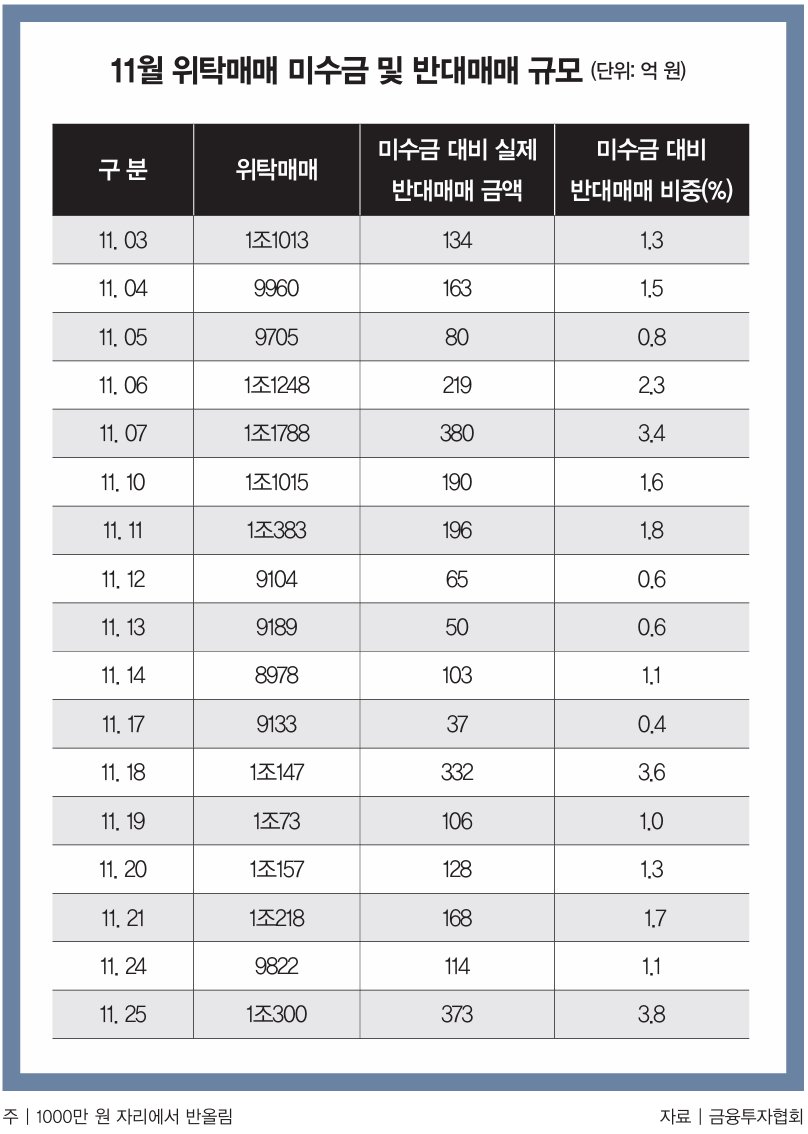 롤러코스터 증시 속 반대매매 ‘줄청산’ 위험은 수치로 감지되고 있다. 금융투자협회(금투협)에 따르면 11월(3~25일) 위탁매매 미수금은 일평균 1조 원을 넘어섰다(표 참조). 이 가운데 실제 반대매매로 이어진 금액은 연중 최고 수준인 2836억9500만 원이었다. 특히 11월 7·18·25일에 각각 300억 원 넘는 반대매매가 쏟아지면서 미수금 대비 반대매매 비중이 3%대로 치솟았다. 11월 초 4200대를 오가던 코스피가 이후 3900대로 내리면서 미수거래 대금을 제때 상환하지 못한 개인투자자가 크게 늘어난 영향이다. 향후 증시가 추가 하락하면 반대매매 규모는 이보다 더 늘어날 수 있다.