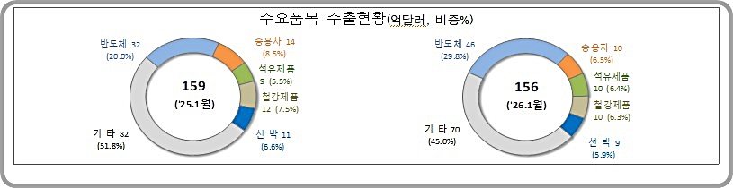 수출의 경우 지난해 같은 기간 대비 반도체(45.6%), 석유제품(13.2%), 무선통신기기(33.7%), 컴퓨터주변기기(25.8%) 등은 증가한 반면 승용차(24.7%), 선박(12.7%), 선박(18.7%) 등은 감소했다.