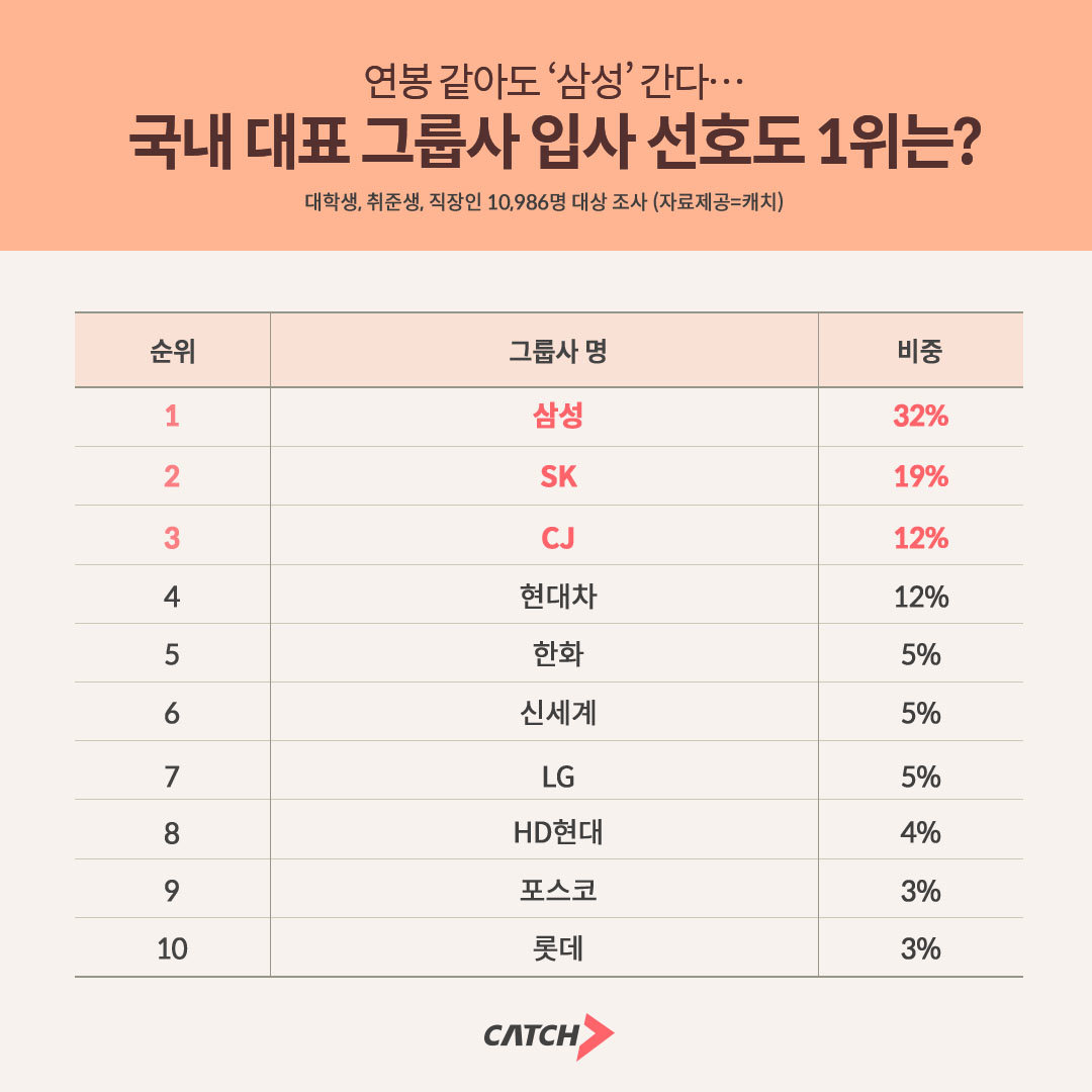 20일 채용 플랫폼 진학사 캐치가 대학생·구직자·직장인 1만986명을 대상으로 ‘연봉이 동일할 경우 근무하고 싶은 그룹사’를 조사한 결과, 올해 입사 선호도 1위는 삼성(32%)이었다.