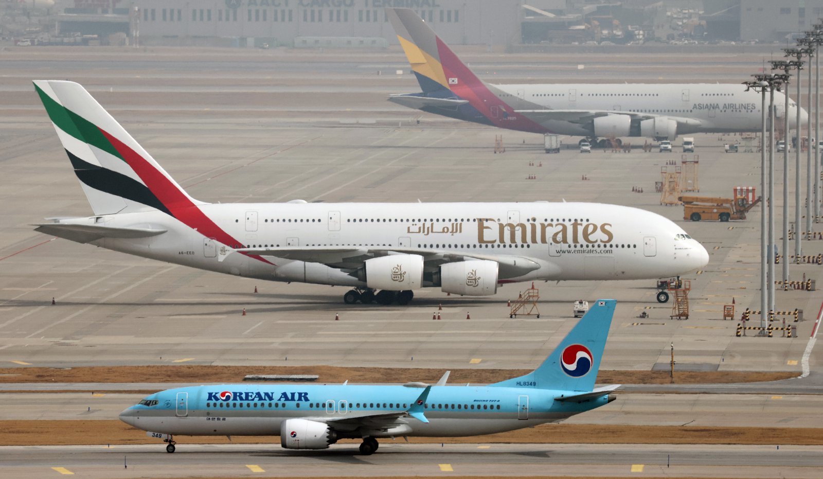 미국과 이스라엘의 이란 공습과 이에 맞선 이란의 보복으로 중동 하늘길이 사실상 마비된 가운데 5일 인천국제공항에 에미레이트 항공 여객기가 계류돼 있다. 2026.3.5 뉴스1정부는 현재 국토교통부와 대한항공이 UAE 당국과 함께 항공편 재개 일정에 대해 긴밀히 소통하고 있다고 설명했다.