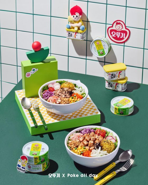 이번 협업은 헬시플레저가 지속되는 트렌드를 겨냥한 것으로 오뚜기의 \'가벼운참치\'와 \'칰햄\'을 이용한 새 메뉴를 포케올데이 매장에서 선보인다.