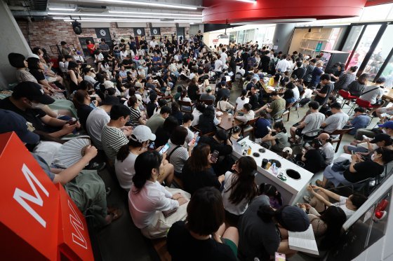 25일 오후 서울 강남구 위메프 본사가 ‘정산 지연 사태’로 환불을 요구하는 고객들로 붐비고 있다. 2024.7.25. 뉴스125일 오전 서울 강남구 위메프 본사. 건물 1층에 200여 명이 웅성대고 있었다. 직장인 이모 씨(35)는 급히 직장에 휴가를 내고 오전 7시 30분 집에서 나와 위메프 본사에서 환불을 기다렸다. 7월 초 위메프·티몬에서 산 130만 원어치 상품권을 환불받기 위해서다. 이날 오후 2시가 되자 더 많은 사람이 몰렸다. 본사 1층과 주차장, 복도까지 신문지를 깔고 앉은 이가 400여 명이었다. 사람들이 좁은 장소에 너무 많이 몰리면서 통신 장애가 발생해 휴대전화가 1시간가량 먹통이 됐다. 위메프 관계자는 “오전 6시 30분에 접수한 소비자가 10시 30분쯤 환불을 받았다”며 “이곳에서 밤을 새운 사람도 많다”고 말했다.