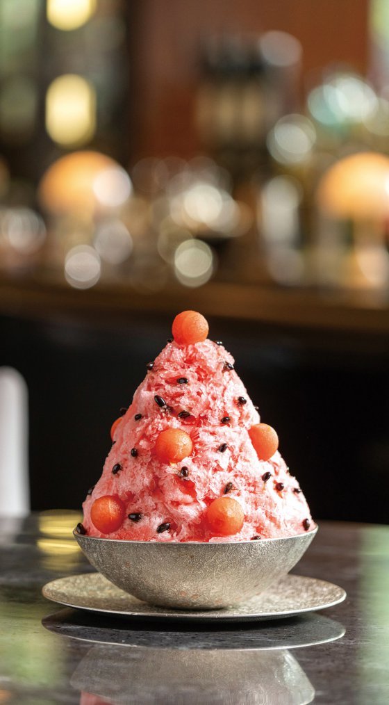 웨스틴 조선 서울 라운지앤바의 수박빙수망빙은 겹겹의 망고 조각이 소복하게 빙수를 덮고 있었다. 스푼으로 떠먹는데 망고 조각 케이크를 먹는 기분도 들었다. 날이 갈수록 비싸지는 호텔 빙수 가격이 요즘 화제다. 누군가는 지나친 상술이라고 했고, 누군가는 “호텔 빙수는 샤넬백 같은 게 아닐까”라고 했다. 소비의 기준에는 가성비도 있고 가심비도 있다. 확실하게 말할 수 있는 건, 이날 맛본 망빙은 최상급 당도의 제주산 애플 망고 과육을 사용해 그 맛이 깊고 풍성했다는 것이다. 여름에 부려보는 궁극의 사치가 호텔 빙수를 먹는 것 아닐까.