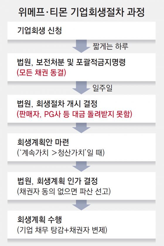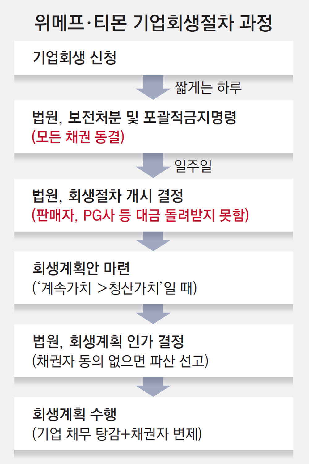 티몬과 위메프는 기업회생 신청 이후 입장문을 내고 “판매회원과 소비자들의 피해를 최소화하기 위한 방안으로서 부득이하게 회생 개시 신청을 하게 됐다”고 밝혔다. 기업회생절차는 법원에서 지정한 제3자가 자금을 비롯한 기업 활동의 전반을 대신 관리하는 제도다. 이 절차에 돌입하면 부채가 동결돼 원금과 이자 지급이 중지된다. 회생절차를 위한 채권단의 동의를 끌어내지 못할 경우 파산을 신청할 가능성도 있는데 이 경우 피해자 보상은 더욱 힘들어질 수 있다.