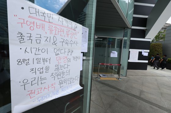 티메프(티몬,위메프) 사태가 이어지고 있는 31일 오후 서울 강남구 위메프 사옥에 구영배 큐텐 대표, 류화현 위메프 대표, 류광진 티몬 대표에 대한 수사를 촉구하는 피해자들의 항의문이 붙어 있다. 2024.07.31. 뉴시스●계열사 다른 플랫폼에서도 미정산 발생