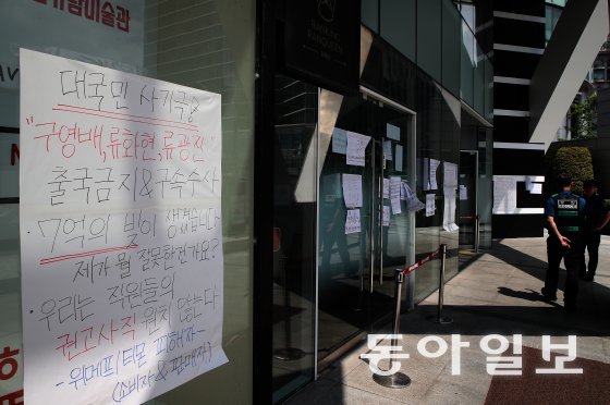 31일 오후 서울 강남구 삼성동 위메프 1층에 ‘대국민 사기극’이라고 쓰인 대자보가 붙어 있다. 1층은 경찰들이 외부인 출입을 통제하고 있고 3층에는 정산금을 받지 못한 판매자들이 대표실 등을 점거하고 있다. 변영욱 기자 cut@donga.com티몬·위메프가 기업회생절차(법정관리)를 신청한 가운데 인터파크커머스와 AK몰 등 큐텐그룹 다른 계열사로도 판매대금 정산 지연 사태가 확산하고 있다. 지난달 30일 국회 정무위원회 긴급 현안 질의에 출석한 구영배 큐텐 대표가 “인터파크커머스나 AK몰도 정산이 중단될 수 있다”고 발언했는데, 우려가 현실이 된 것이다. 게다가 해외 계열사에서도 판매대금을 받지 못했다는 판매자 주장이 나오면서 파장이 확대되는 모양새다.