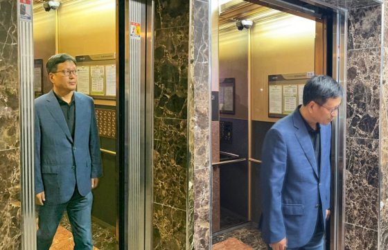 구영배 큐텐 대표가 1일 오후 서울 서초구 반포동 소재 자택에 도착해 엘리베이터에서 내리고 있다. 2024.8.1. 뉴스1 티몬과 위메프 미정산 사태로 검찰이 경영진에 대해 전방위 압수수색을 벌이는 가운데 구영배 큐텐 대표가 서울 서초구 자택 앞에 모습을 드러냈다.