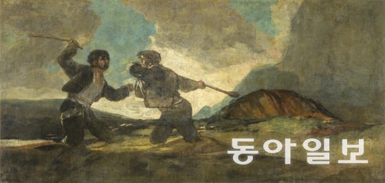 ‘검은 그림’ 연작 중 ‘곤봉 결투 or 죽음에 이르기까지 계속되는 곤봉 결투’(Duel with Cudgels, or Fight to the Death with Clubs) ©Museo Nacional del Prado고야가 검은 그림을 자기만을 위해 그렸는지 먼저 따져봐야 합니다. 그림이 있는 집은 고야가 아들과 손자에게 물려주기 위해 매입한 것이에요. 그러니 그곳의 그림도 자식들에게 보여주기 위한 것이었겠죠.
