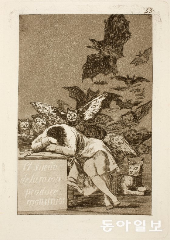 고야의 카프리초스 판화 연작 중 ‘이성이 잠들면 괴물이 깨어난다’ ©Museo Nacional del Prado정확합니다. 고야가 모더니즘의 문을 열었죠. 인간 내면의 어두운 부분을 끄집어냈다는 점에서요. 히에로니무스 보쉬가 그랬던 것처럼요. 물론 검은 그림은 공개적으로 그린 것이 아니지만, ‘카프리초스’ 같은 판화는 시중에 보급했어요.