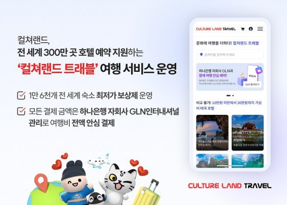 컬쳐랜드 트래블 호텔 예약 서비스는 컬쳐캐쉬 및 신용카드 등 다양한 결제 수단으로 국내 및 전 세계 호텔 약 300만 곳을 저렴하게 예약할 수 있다. 특히 최저가 보상제를 비롯해 고객이 지불한 여행 상품 결제금액 전액을 하나은행의 글로벌 결제 네트워크 자회사인 GLN인터내셔널에서 보관하는 안심 결제 서비스도 같이 시행해 여행기간 동안 고객이 안심하고 이용할 수 있다고 전했다.