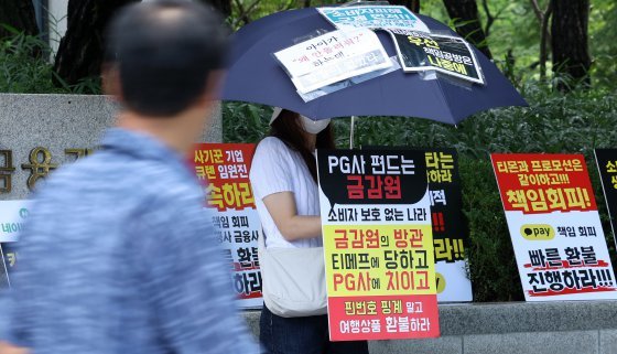 티몬·위메프(티메프) 피해자가 지난 7일 오후 서울 여의도 금융감독원 앞에서 여행상품 환불 지원방안을 촉구하는 릴레이 우산 시위를 진행하고 있다.ⓒ News1산업통상자원부는 8일 위메프·티몬 사태와 관련해 유통학회 등 전문가 및 업계 간담회를 순차적으로 열었다고 밝혔다. 산업부는 이번 사태가 다른 e-커머스 업체로 확산하지 않도록 업계 현황을 점검하고, 제도 개선을 위한 의견을 수렴했다.