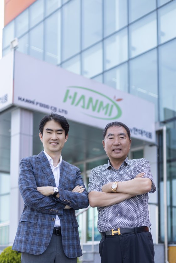 박승백 한미식품 회장(오른쪽)과 박호서 총괄대표.충남 논산시 강경읍에는 두부를 튀겨낸 고소하고 부드러운 유부 제품들과 최근 건강식으로 수요가 높아진 곤약을 다양한 형태로 생산해 대기업에 납품하는 강소기업이 있다. ㈜한미식품(대표 박승백)이다.