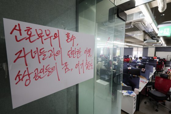 서울 강남구 위메프 본사에 미정산 피해자들이 작성한 항의문이 붙어 있다. /뉴스1또 다른 소비자는 “결제사에서 이번 주에는 환불해 주려나 기대했는데 어려울 것 같아서 접수 마감일에 집단분쟁조정을 신청하게 됐다”고 전했다.