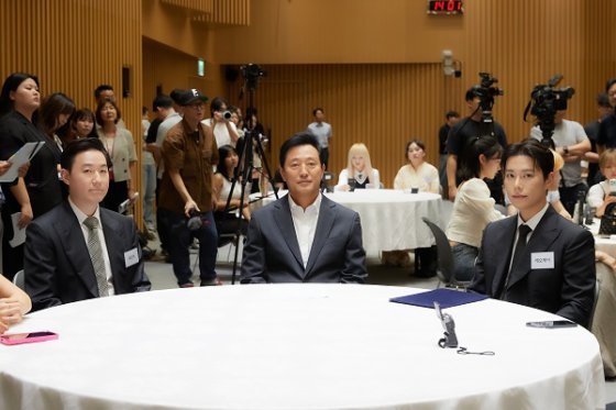 (왼쪽부터) 최인석 레페리 의장과 오세훈 서울시장, 뷰티 크리에이터 레오제이가 12일 서울시청 신청사에서 열린 서울뷰티위크 홍보단 발대식에 참석했다. 사진제공=레페리레페리 소속 뷰티 크리에이터 레오제이가 ‘서울뷰티위크’의 홍보단 대표로 위촉됐다.