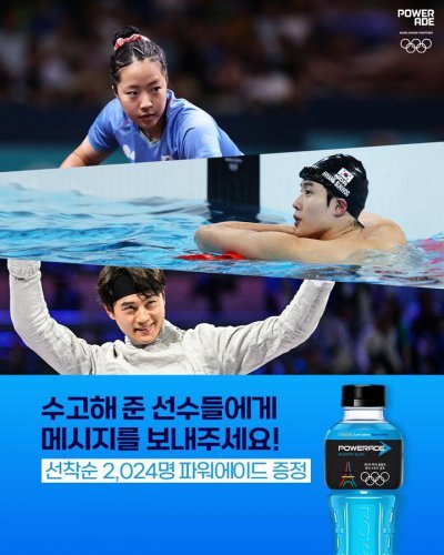 한편 파워에이드는 2024 파리 올림픽을 맞아 펜싱 국가대표 오상욱, 탁구 국가대표 신유빈, 수영 국가대표 황선우를 브랜드 모델로 발탁하고 ‘나만의 순간 멈추지 않는 파워’ 캠페인을 진행해왔다. 올림픽 스페셜 패키지가 적용된 파워에이드 마운틴 블라스트를 출시하고 진천 국가대표선수촌을 찾아 국가대표 선수들에게 파워에이드 스페셜 기프트를 전달하는 등 활동들을 진행해왔다.
