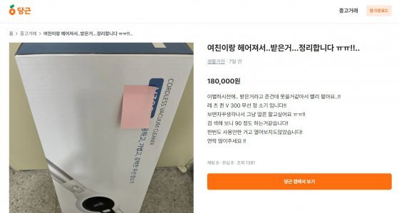 당근 내에서 전문판매업자 수법으로 의심되는 게시글 사례. 애인과 헤어졌다는 사유로 무선 청소기를 판다는 글이다. 오픈마켓서 제품을 검색해보면 거래 건수나 이용자 후기가 전혀 없는 스마트스토어만이 나올 뿐이다./뉴스1 ⓒ News1 중고거래 플랫폼이 전문판매업자의 ‘탈세 사각지대’로 변질됐다는 지적이 나온다. 업자들이 ‘사재기 후 리셀’ 등 실질적인 중간 유통을 하는 데다 중고거래를 빙자한 판매까지 하는데도 세금을 내지 않는단 것이다.