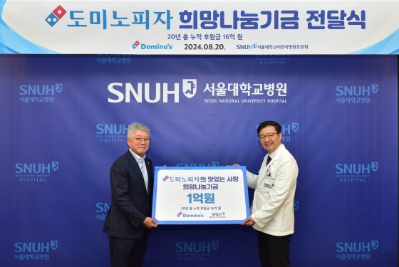도미노피자가 자사의 희망 나눔 캠페인을 통해 모인 적립금과 임직원들의 기부로 조성된 희망 나눔 기금을 합친 1억 원을 서울대어린이병원에 전달했다고 20일 밝혔다.
