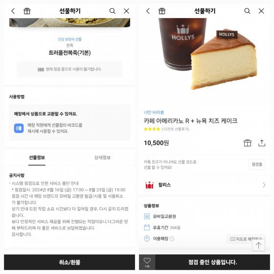 카카오톡 선물하기에도 해당 브랜드의 교환권은 오는 23일까지 시스템 점검으로 인해 사용이 불가능하다고 공지돼 있다. 서비스 재개 여부도 불투명하다.