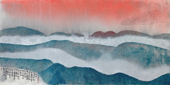 금제 김종태 화백의 작품 ‘청산별곡’.심혈을 기울인 미세한 ‘뫼 산(山)’ 자를 동원해 몽환적인 작은 산을 이루며 웅혼한 봉우리가 탄생한다. 가까이 들여다보면 봉우리마다 수많은 한문 초서체 ‘山’ 자가 점점이 박혀 거대한 백두대간을 형성했다. 수묵화인 듯 동양화인 듯 1870년대 프랑스의 인상파 조르주 피에르 쇠라의 점묘화처럼 여백을 작은 글씨의 조합으로 채우면 서양화 기법마저 묻어난다.