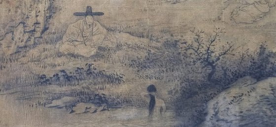 거문고 산조를 연주하는 3명의 악사. 세운미술관 제공여인은 긴 머리칼을 왼손으로 잡고 하반신만을 물속에 넣은 채 알몸을 양반에게 보여주고 있다. 얼굴이 경직된 양반은 몸을 앞으로 약간 숙이고 여인을 응시하고 있다. 좌석에서 이탈한 양반의 호색함을 표현한 것으로 보이며 야유풍류에서 양반의 일탈을 그린 것이다.