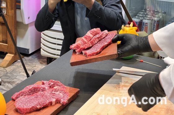 27일 열린 이날 ‘한우자조금×MEAT(MEET) UP 시식회’에서 한우 명예홍보대사 윤원석 셰프(벽제갈비 장인)가 직접 한우 커팅 시연을 선보이며 미경산우 및 거세우의 맛 차이와 특징 등을 설명하고 있다. 윤우열 기자 cloudancer@donga.com한우자조금은 27일 서울 영등포 인근 한우 전문점에서 ‘우(牛)라차차 대한민국! 뚝심 보충, 한우’ 캠페인의 시작을 알리는 기자간담회를 열었다. 이날 행사에는 이동활 한우자조금관리위원장과 김연화 소비자공익네트워크 회장 등 소비자단체, 임재화 한인홍 대표 등 한우 수입 바이어 등이 참석했다.