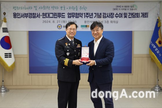 27일 경기도 용인시 기흥구 용인서부경찰서에서 박홍진 현대그린푸드 사장(사진 오른쪽)과 김병록 용인서부경찰서장(사진 왼쪽)이 기념사진을 촬영하고 있는 모습.