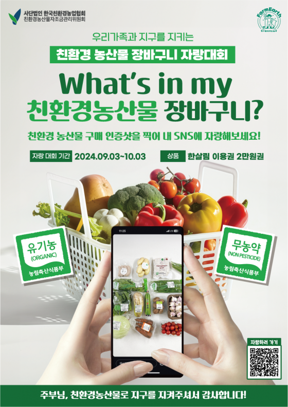 친환경농산물자조금관리위원회가 오는 9월 3일부터 한 달간 친환경 농산물 장바구니 인증사진 이벤트를 진행한다. 친환경농산물자조금 제공친환경농산물자조금관리위원회가 오는 9월 3일부터 한 달간 친환경 농산물 장바구니 인증사진 이벤트를 진행한다고 밝혔다.