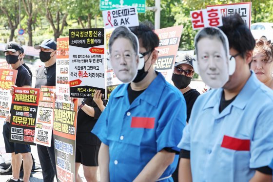 티몬·위메프(티메프) 대규모 판매대금 정산 지연 사태 피해자들이 구영배 큐텐 대표, 류광진 티몬 대표, 류화현 위메프 대표이사의 얼굴이 걸린 판자를 향해 물풍선을 던지며 울분을 토했다.