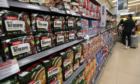 서울 시내의 한 대형마트에 라면이 진열돼 있다.ⓒ News1 라면, 과자, 음료, 쌀가공식품 등 수출이 역대 최대 실적을 기록했다. 특히 라면은 8월 한 달간 1억 달러 이상을 수출하며 호조세를 이어갔다.