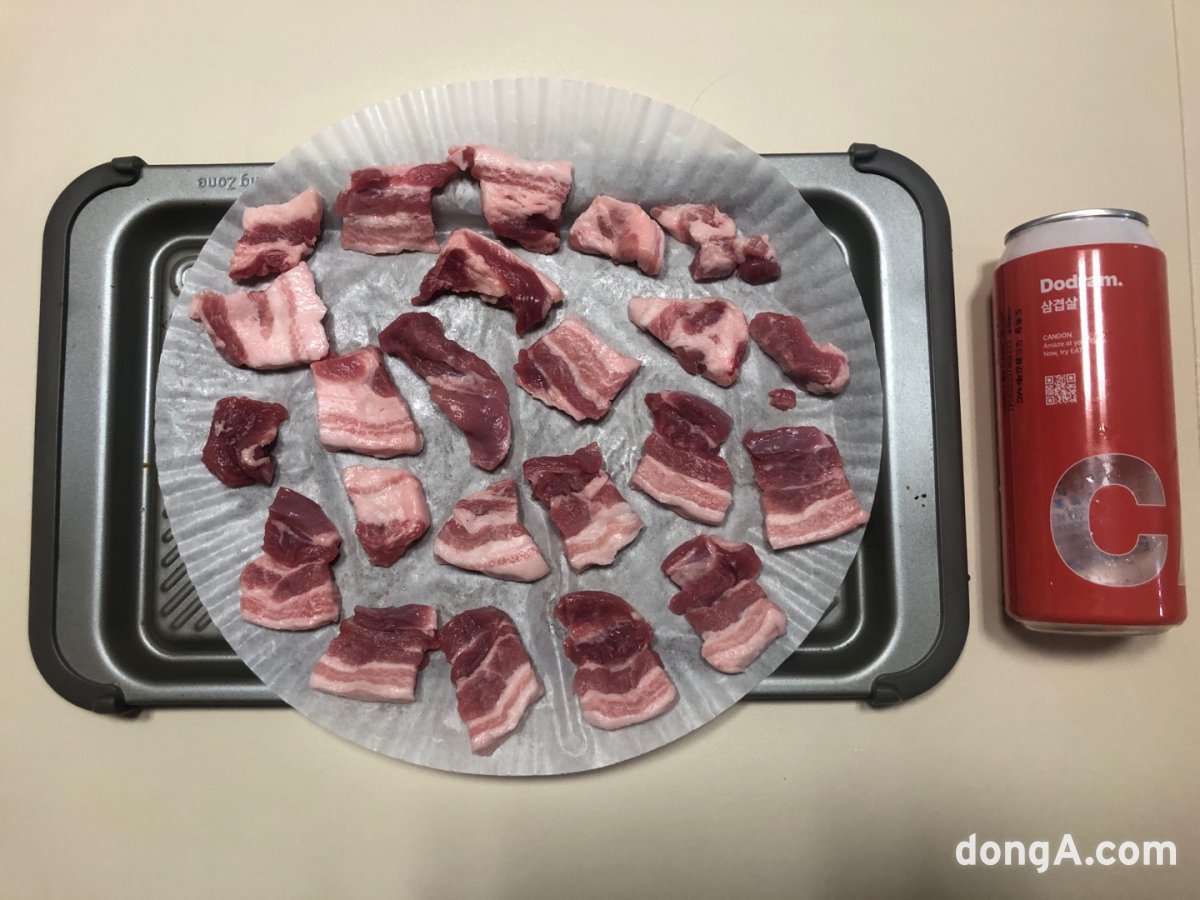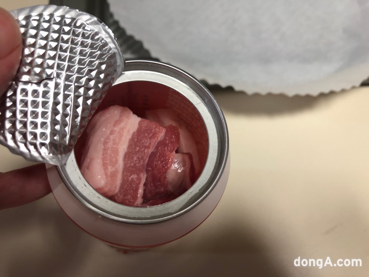 뚜껑을 열면 한 입 크기의 삼겹살이 빼곡히 들어차 있다. 맥주캔 500ml 크기 캔돈에는 삼겹살 300g가 빼곡히 들어차 있다. 일일이 꺼내보니 스물 네 조각이 나왔다. 고기 모양에 따라 조각 수는 편차가 있을 수 있다. 때깔 좋은 분홍 살코기와 비계층 비율이 적절해 보는 것만으로도 군침이 돈다. 들여온 캔돈 6개 모두 고기와 지방 비율이 일정해 품질에 신뢰가 갔다. 내심 비계 삼겹살이 올까봐 걱정했지만 내용물은 최상급이었다. 생고기가 담겨진 특성상 소비기한은 10일로 짧은 편이다.