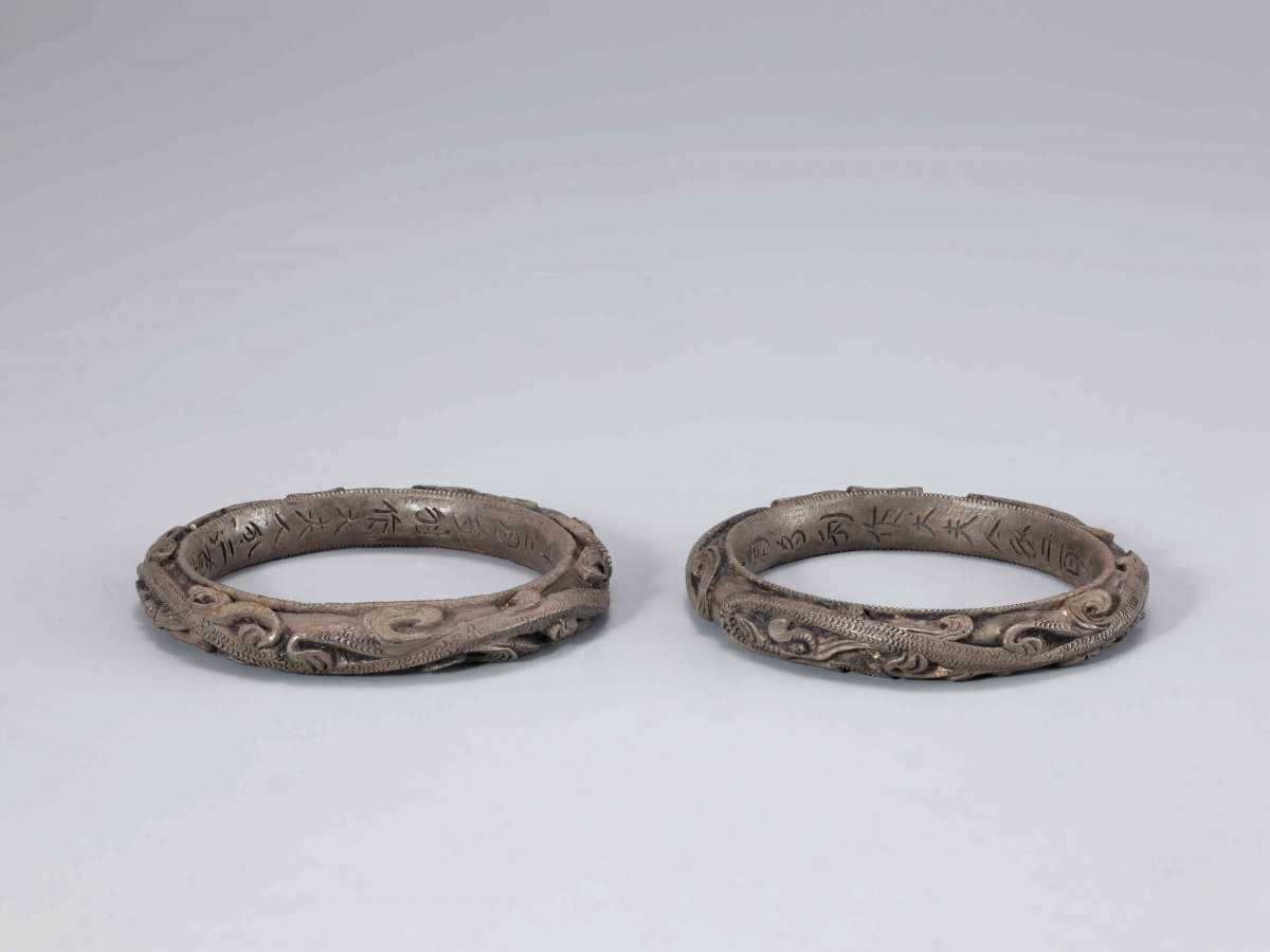 무령왕릉에서 발견된 ‘무령왕비 은팔찌’. 두 점의 팔찌 바깥 면에는 용무늬가 정교히 새겨졌고, 안쪽 면에는 제작 시기와 제작자의 이름 등이 구체적으로 명기돼 있다. 국립공주박물관 제공박물관 관계자는 “전시실에 들어서면 마치 책 속에 들어온 듯한 느낌을 받을 것”이라며 “관람객의 눈높이에 맞춰 백제의 용을 새롭게 시각적으로 경험할 수 있도록 했다”고 설명했다. 주요 전시품을 3D 고화질 데이터로 재현한 영상에선 육안으로 관찰하기 어려운 용 무늬를 세밀하게 관찰할 수 있다. 내년 2월 9일까지.